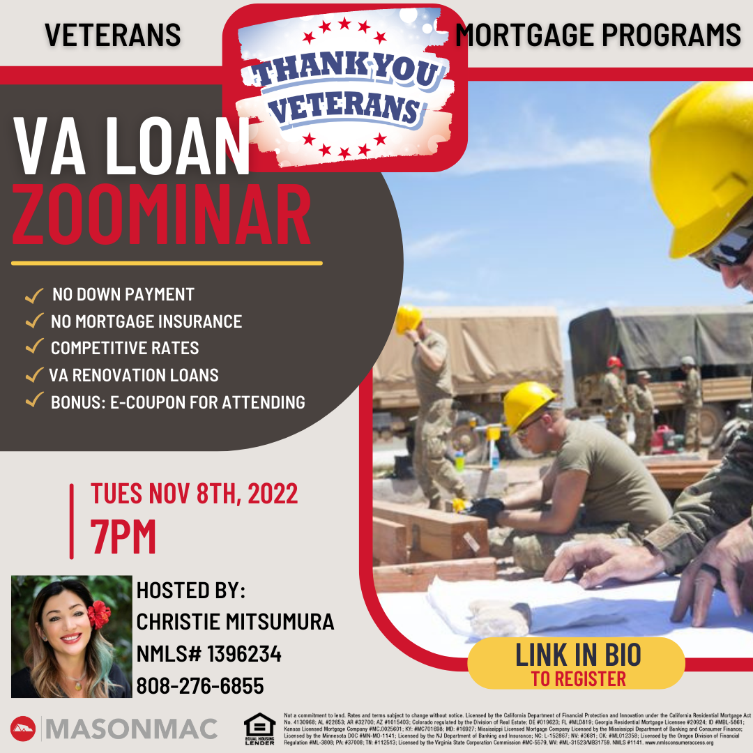 I will be over a VA home purchase and a VA home refinance in this educational zoominar. Join me to learn the details within.